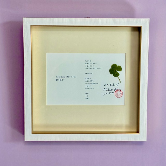 言葉を、空間に置くための作品です。 紙の上にあった言葉を、 日々の中に置けるかたちにしました。 朝の光の中で。 夜の静けさの中で。 ふとしたときに目に入ることで、 心の中に、小さな灯りがともるような。 そのような存在になればと思い、 一点ずつ整えています。 額装した状態でお届けします。 そのまま飾っていただけます。 静かな時間の中で、 あなたの暮らしに、 そっと寄り添う一枚となりましたら嬉しいです。 Size 外寸:223x223x25mm 規格 素材・成分:PS・ガラス・紙・MDF パッケージ:個別箱