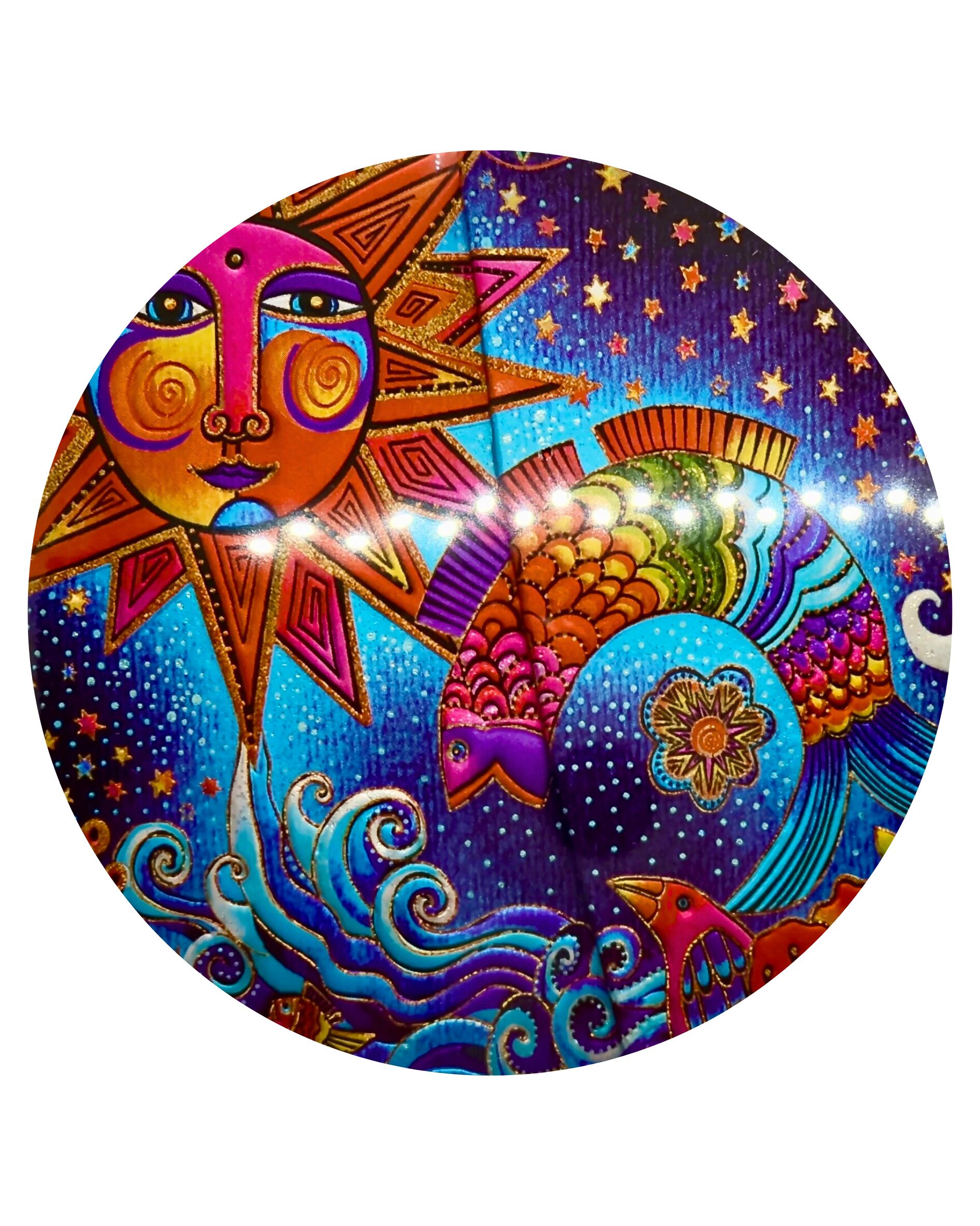 ローレル・バーチは鮮やかな色遣いで、美しい装飾をまとった生き生きと動きのあるアートテーマを生み出しました。太陽や月、星々と戯れる虹色の魚やスプレー状のカラフルな花々を含め、金や銀によって細部まで輝き、鮮やかな彩色でくっきりと描かれたバーチ作品の中で、彼女の天空のテーマは何年にもわたって進化していきました。