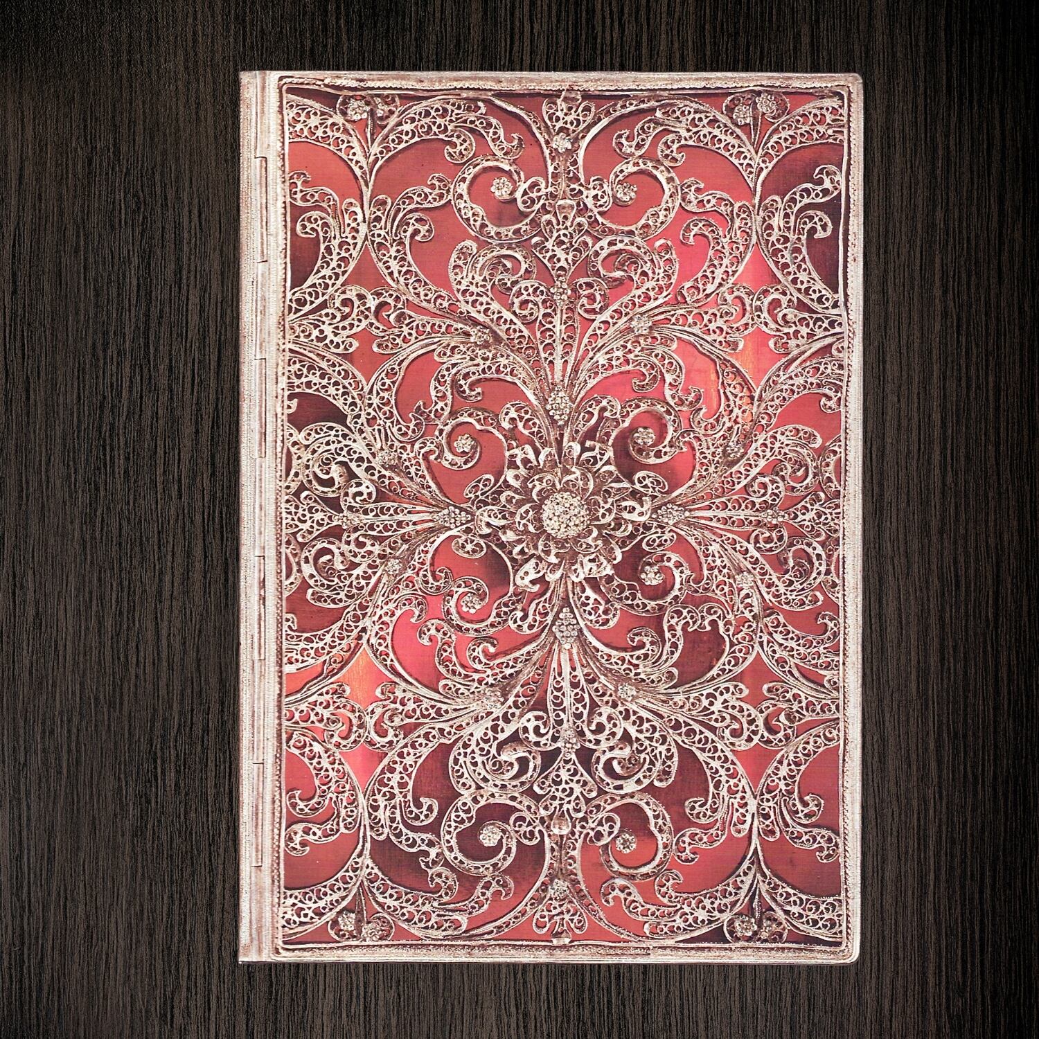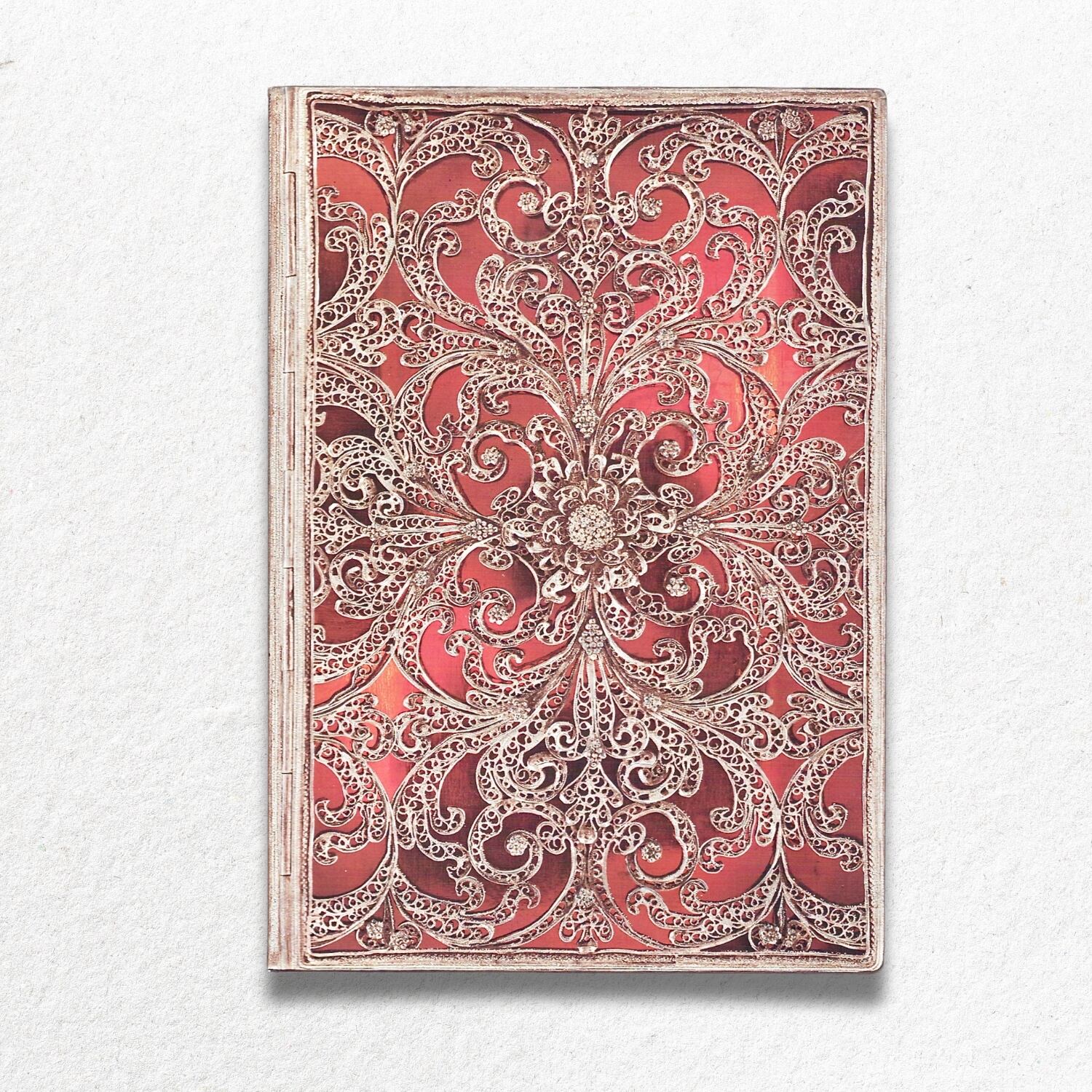 ノートブック = 白紙の「本」をクリエイトするのはあなたです。 考え、 アイデア、 物語や詩を書き留めたり、 写真やチケットなどを貼って思い出を綴ることであなただけの「本」が完成します。入念な手作業による精緻かつ優雅なデザインのノートです。このシルバーフローラル・ガーネットの表紙のオリジナル作品は、1800年代初頭のドイツでデザインされたものです。箔を貼ったモチーフを実現するため、基層となる銀のシートは最初に型で打ち抜き、その表面に入り組んだ溝が丁寧に彫り込まれました。この銀と宝石のような赤いデザインは、フィリグリー細工の技術を最大限に活かしたもので、人間の装飾に対する本能的な要求の証しと言える一つの芸術形式です。